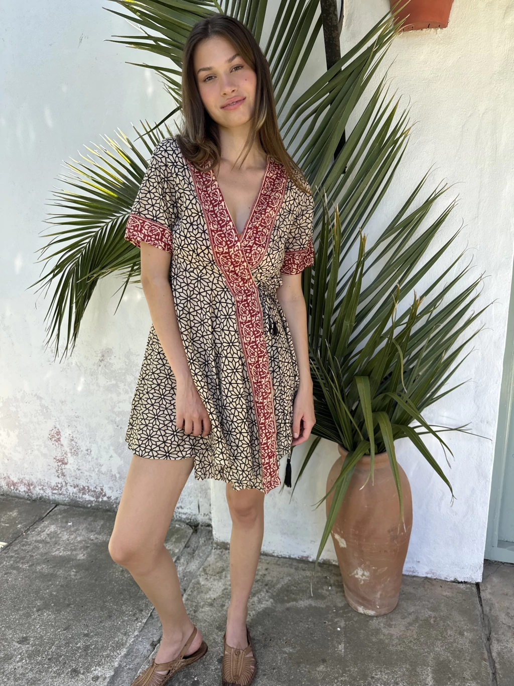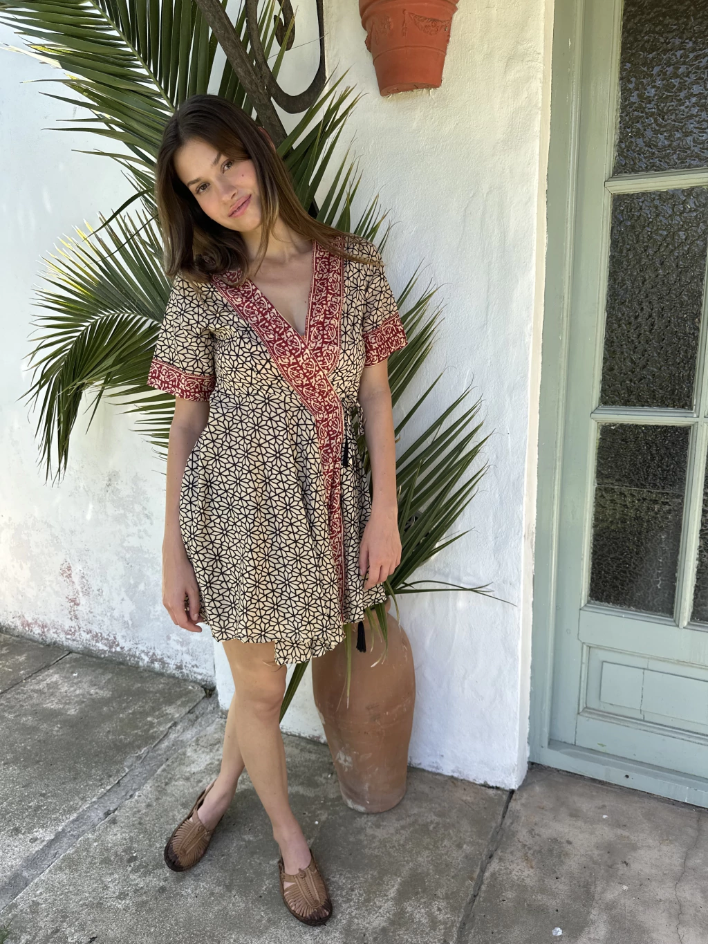 Vestido Jaipur, confeccionado con telas 100% algodón y estampado a mano en India utilizando la técnica de block print. Este modelo único presenta un diseño cruzado con mangas que se adapta perfectamente a cualquier ocasión.